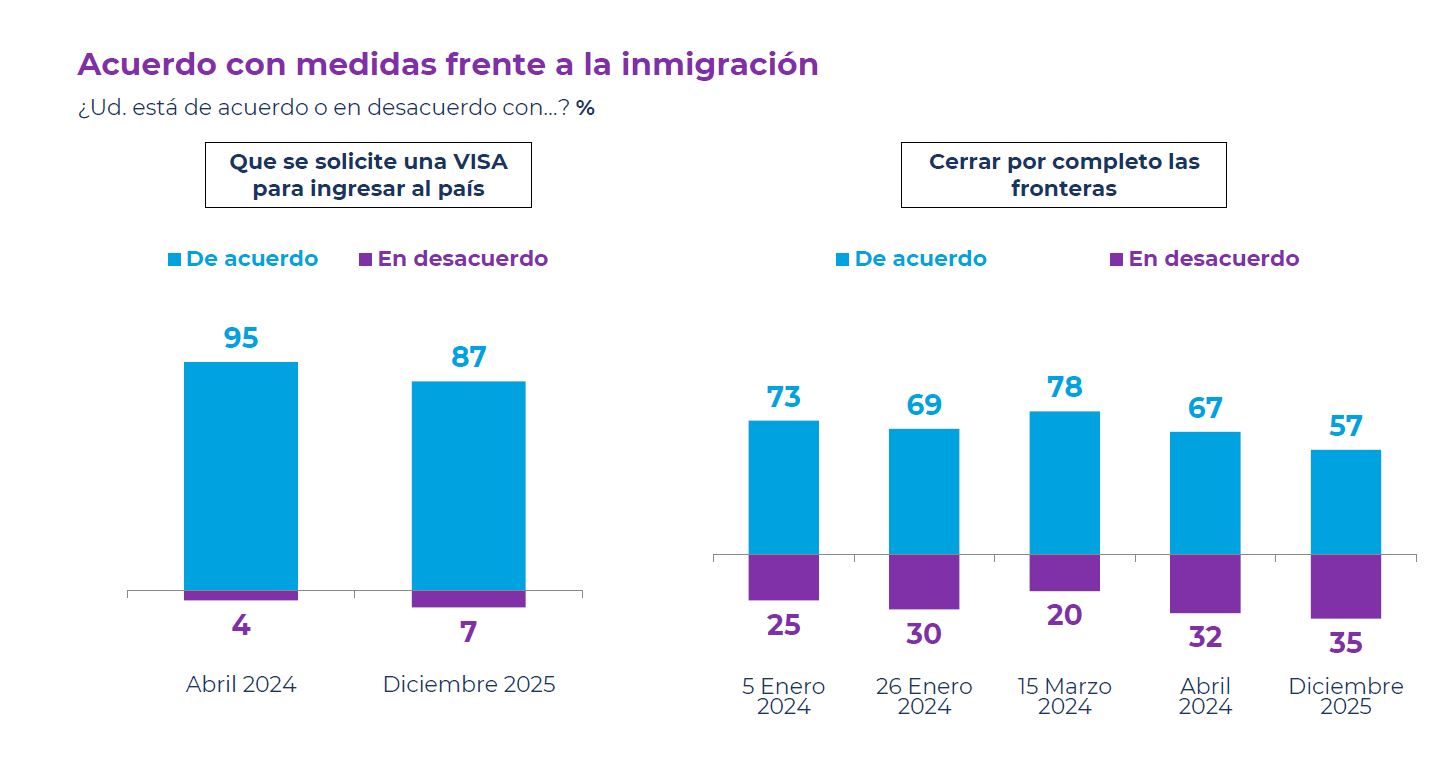 Respecto a las medidas para "frenar la inmigración", uno de los ítems de la encuesta apuntó a: "¿Usted está de acuerdo o en desacuerdo con...?", donde un 87% se mostró "de acuerdo" con la opción "que se solicite una VISA para ingresar al país" y un 7% "en desacuerdo".