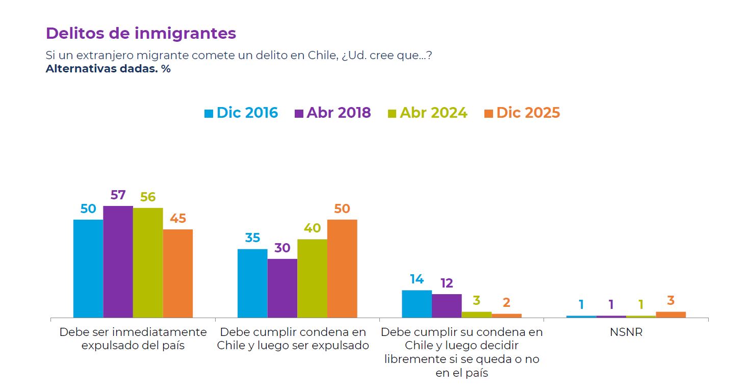 En otro punto, Cadem preguntó: "Si un extranjero migrante comete un delito en Chile, ¿usted cree que...? Un 50% se inclinó por la opción que "debe cumplir condena en Chile y luego ser expulsado", mientras que un 45% dijo que "debe ser inmediatamente expulsado del país", un 2% afirmó que "debe cumplir su condena en Chile y luego decidir libremente si se queda o no en el país" y un 3% señaló "no saber o no respondió".