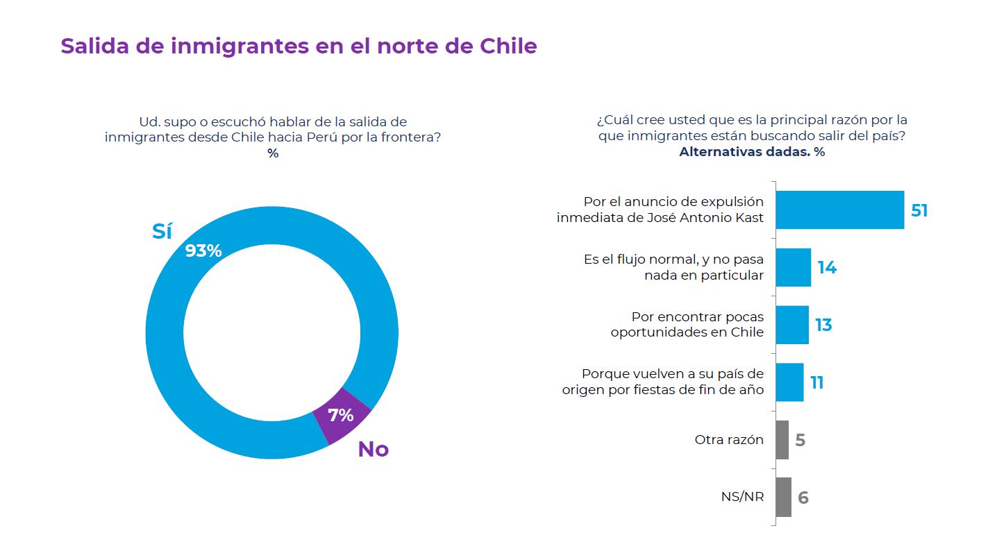 Respecto a la salida de personas en el norte de Chile, la encuesta consultó si "¿ud. Supo o escuchó hablar de la salida de inmigrantes desde Chile hacia Perú por la frontera?", donde un 93% dijo que sí y un 7% no.