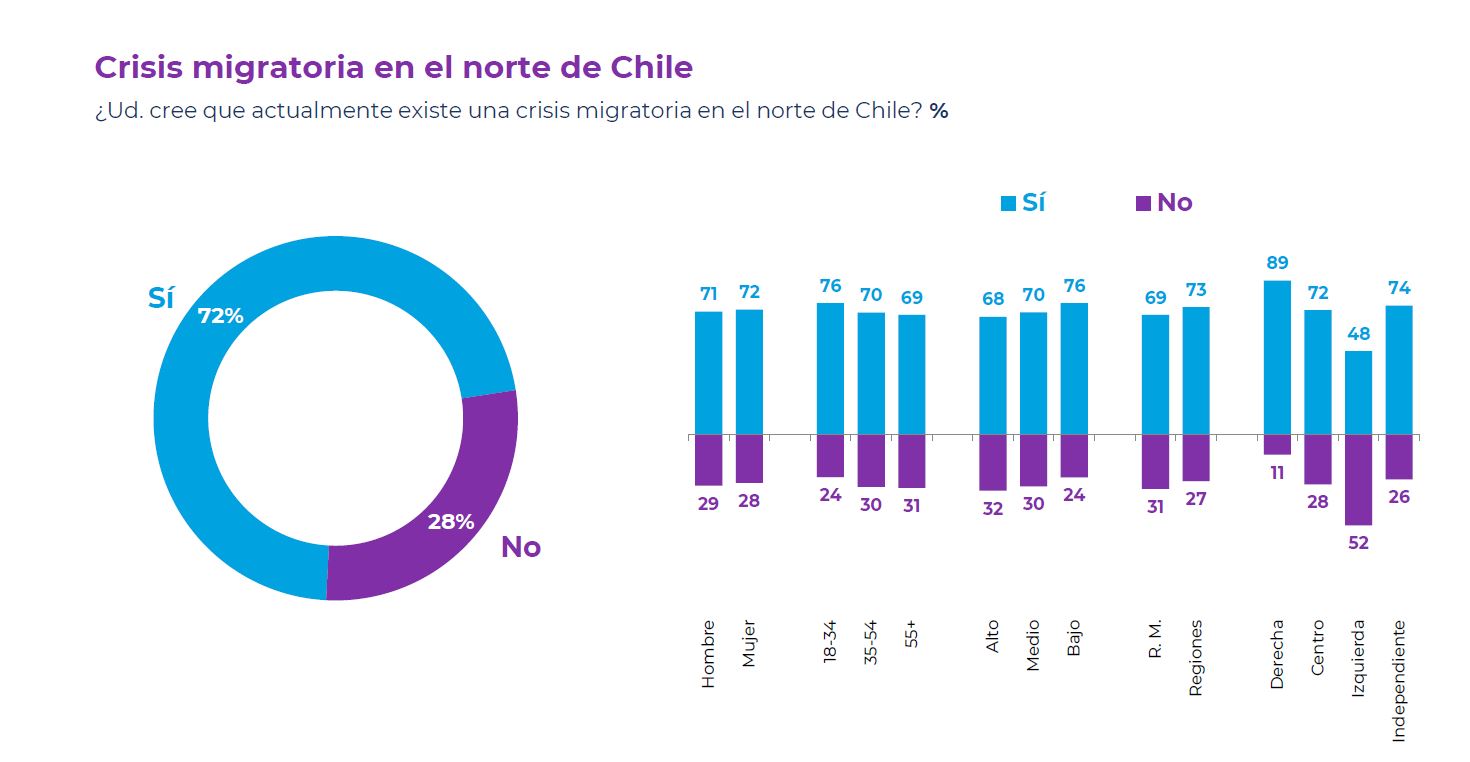 Por último, Cadem preguntó: "¿Ud cree que actualmente existe una crisis migratoria en el norte de Chile?", interrogante a la que un 72% respondió que sí y un 28% que no.