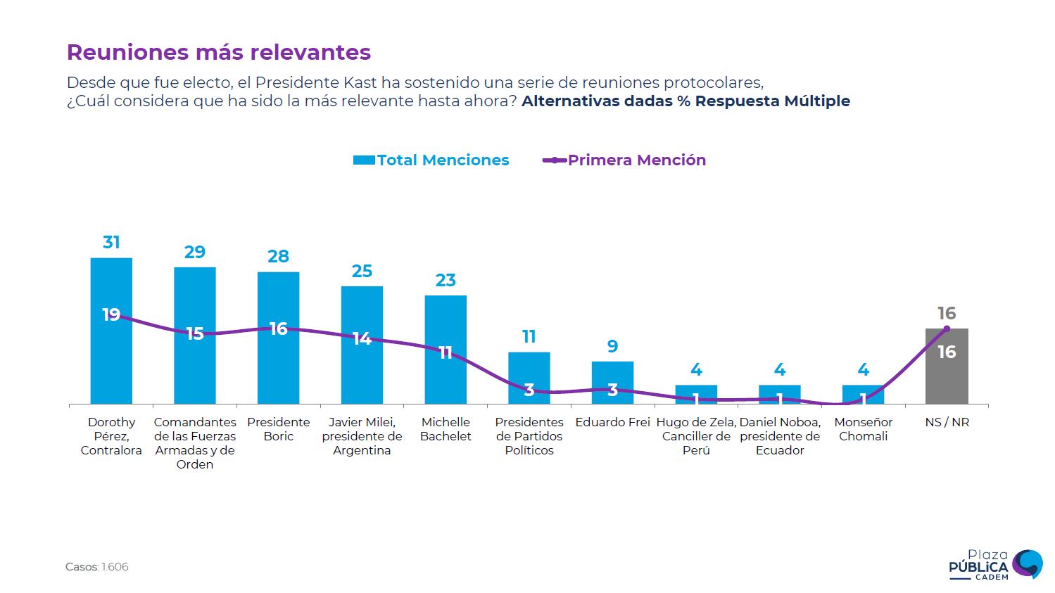 Con esto, el "top 5" de los encuentros del Presidente Electo quedó conformado de la siguiente forma: Dorothy Pérez, Contralora (31%); Comandantes de las Fuerzas Armadas y de Orden (29%); Presidente Boric (28%); Javier Milei, presidente de Argentina (25%) y Michelle Bachelet (23%).