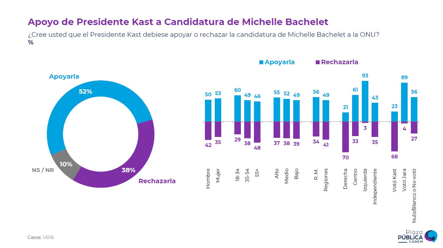 Sobre este último tema se realizó la pregunta: "¿Cree usted que el Presidente Kast debiese apoyar o rechazar la candidatura de Michelle Bachelet a la ONU?", cuestión que es apoyada por una mayoría de los encuestados.