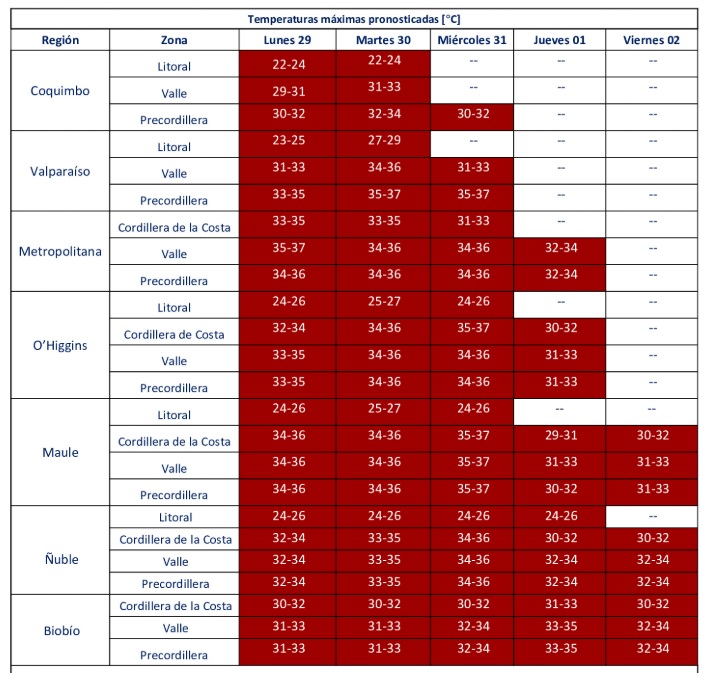 La Dirección Meteorológica de Chile (DMC) actualizó este lunes una advertencia por altas temperaturas a desarrollarse durante esta semana en siete regiones de la zona centro, con máximas que podrían alcanzar los 37°C.
