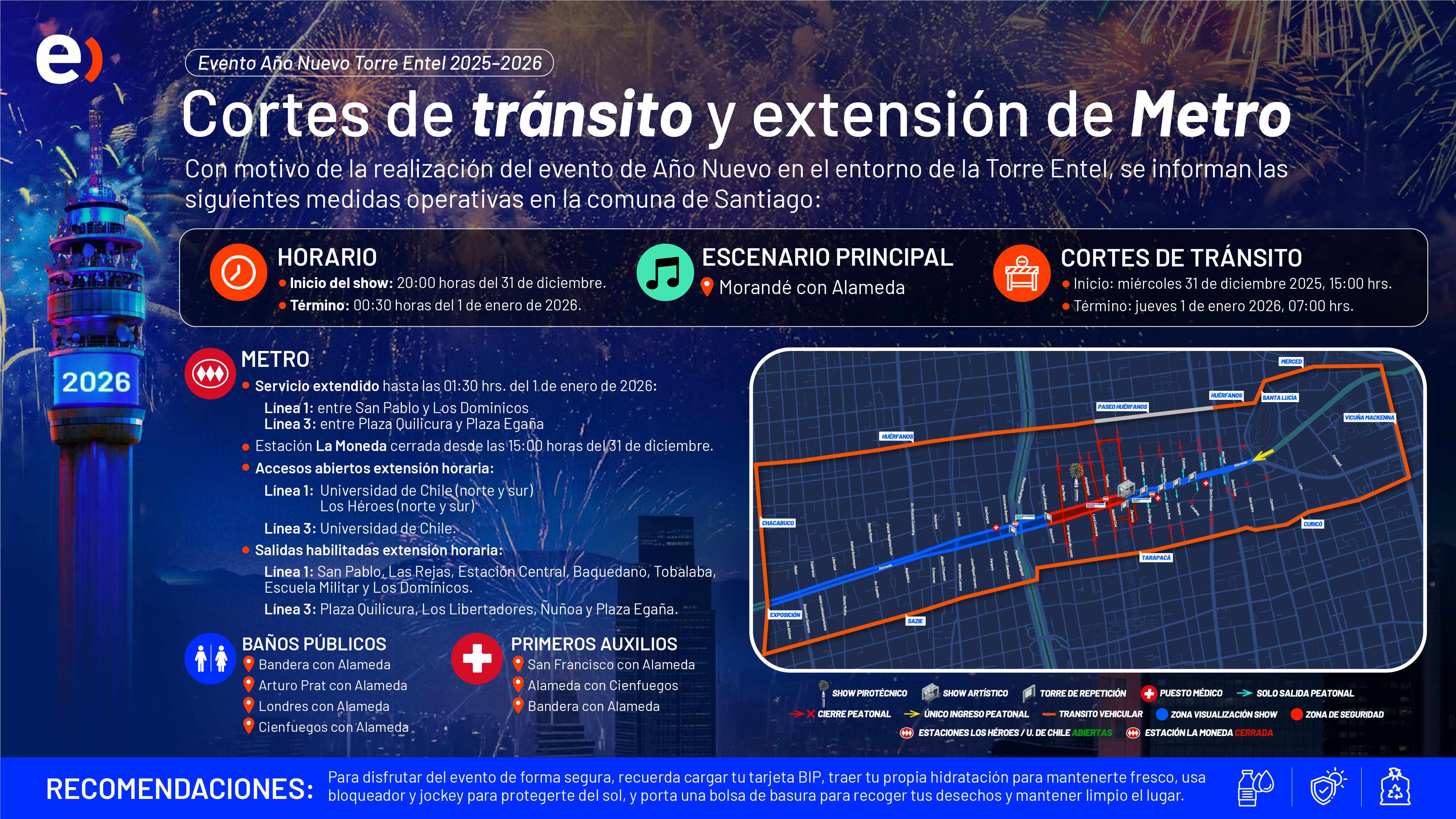 Por otro lado, se reforzará la red de buses y Metro extenderá su servicio en la Línea 1 hasta las 01:30 horas del 1 de enero de 2026. La estación La Moneda, estará cerrada a partir de las 15:00 horas del 31 de diciembre.