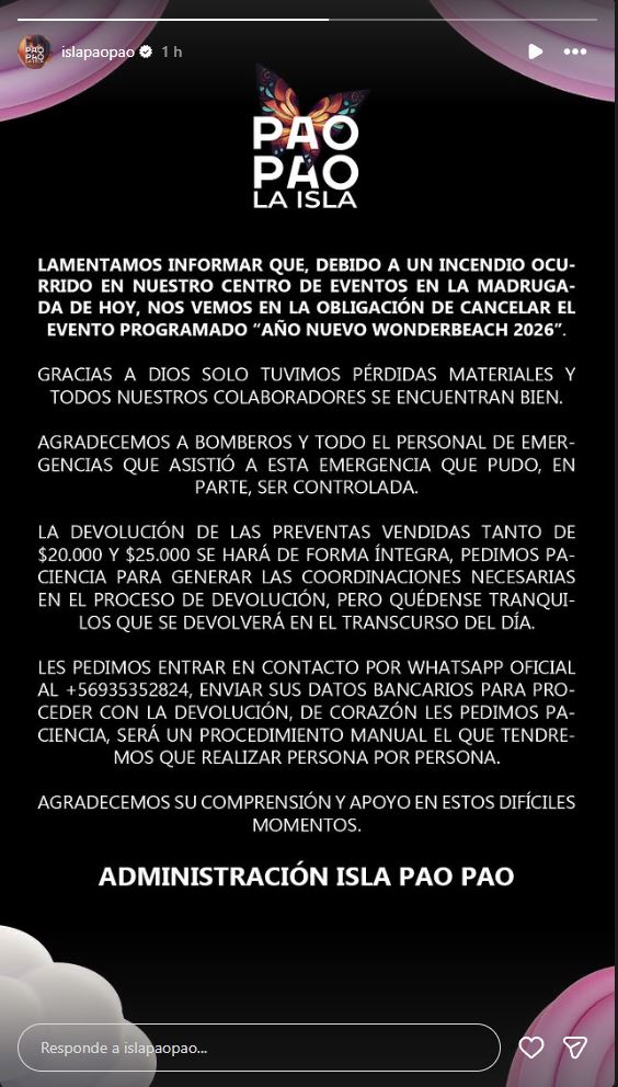 El centro de eventos se preparaba para ofrecer su tradicional show “Año Nuevo Wonderbeach 2026”, pero tras la emergencia se anunció la cancelación del evento y la devolución íntegra de las entradas adquiridas.