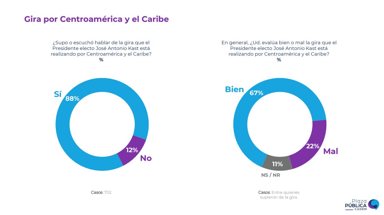 La encuesta Plaza Pública de Cadem de este domingo 1 de febrero estuvo enfocada, entre otros temas, en la gira por Centroamérica y el Caribe del Presidente Electo José Antonio Kast (REP). En la instancia, el futuro mandatario fue a conocer experiencias económicas y de seguridad en la región.