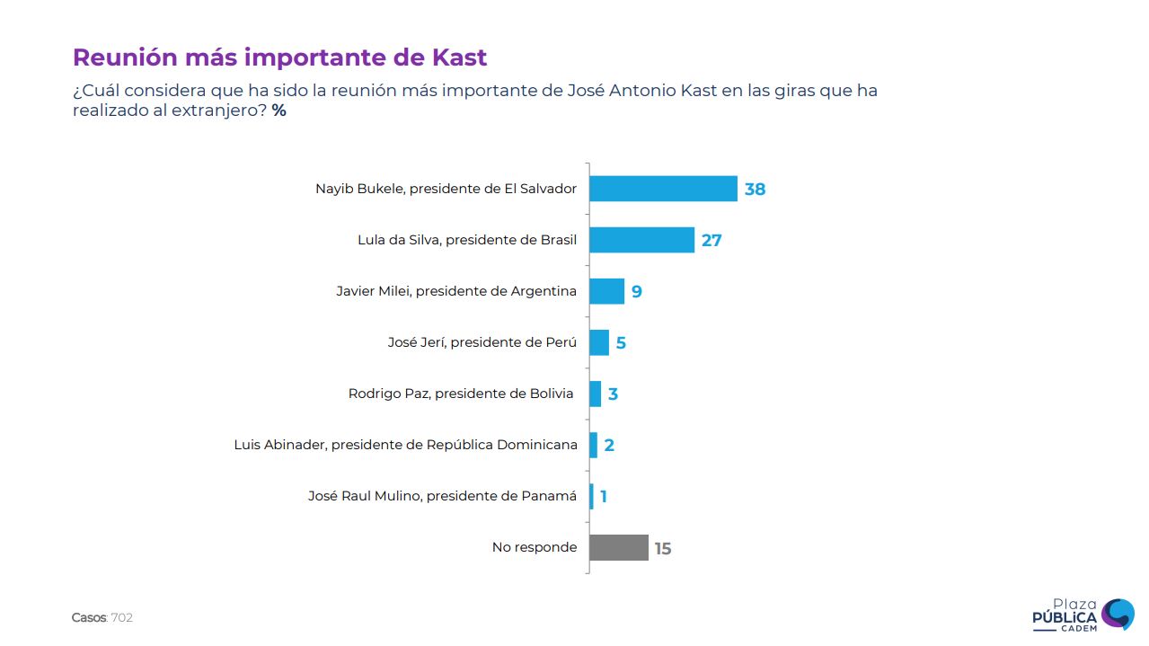 Quienes contestaron la encuesta, consideraron que las tres reuniones más importantes hasta ahora han sido con Nayib Bukele, presidente de El Salvador (38%); Lula da Silva, presidente de Brasil (27%); y Javier Milei, presidente de Argentina (9%).
