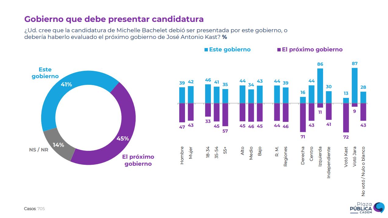 Para esto, una de las preguntas formuladas fue la siguiente: "¿Ud. cree que la candidatura de Michelle Bachelet debió ser presentada por este gobierno, o debería haberlo evaluado el próximo gobierno de José Antonio Kast?".
