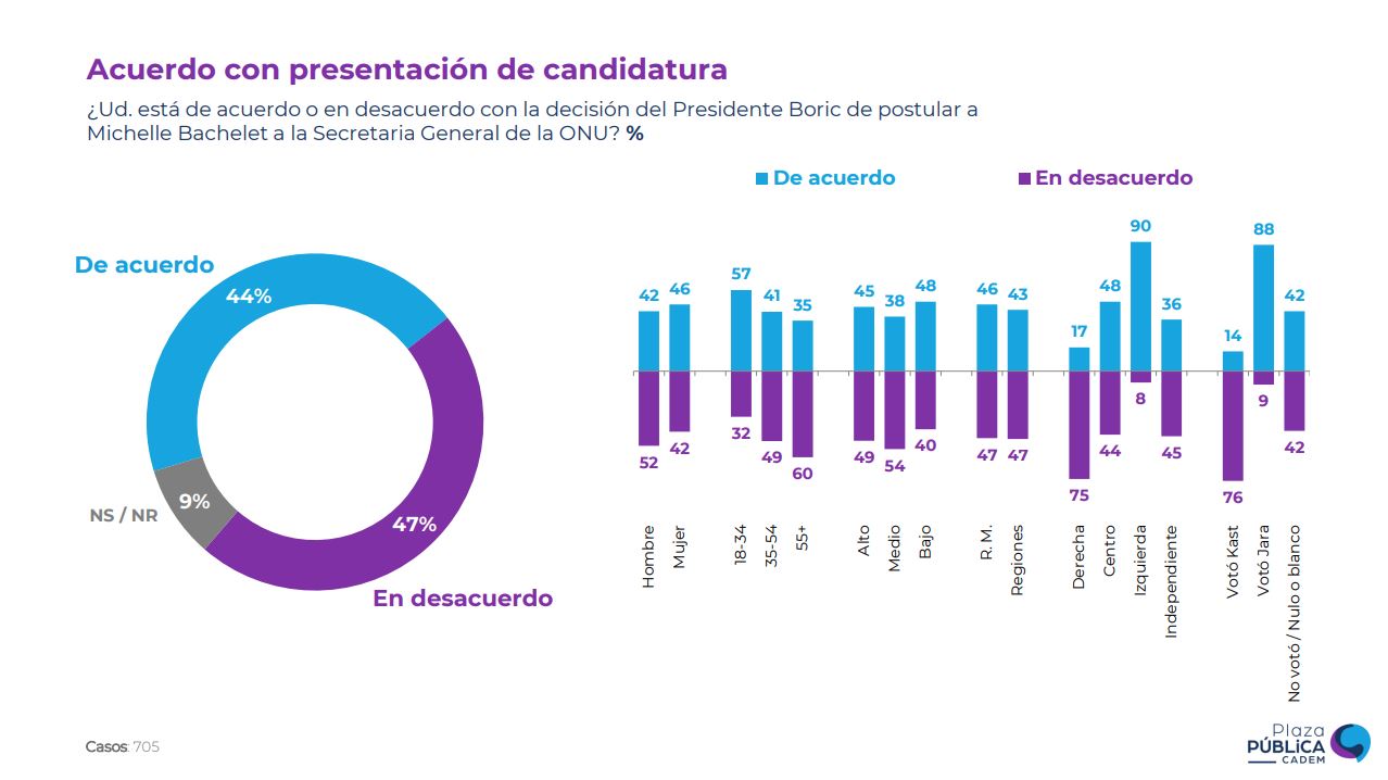 En cuanto al apoyo a la candidatura, Cadem preguntó: "¿Ud. está de acuerdo o en desacuerdo con la decisión del Presidente Boric de postular a Michelle Bachelet a la Secretaría General de la ONU?".
