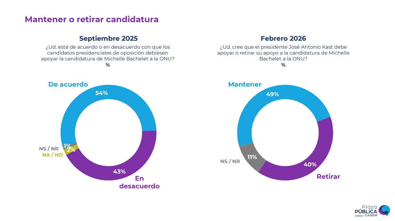 La última consulta al respecto fue: "¿Ud. cree que el presidente José Antonio Kast debe apoyar o retirar su apoyo a la candidatura de Michelle Bachelet a la ONU?".