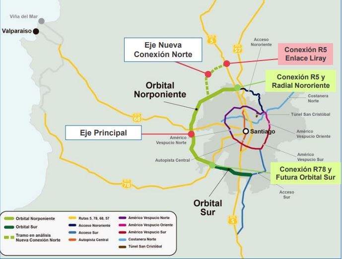 El proyecto Orbital Norponiente de Santiago considera el desarrollo de una nueva autopista urbana que conectará la actual Concesión Acceso Nororiente a Santiago con la Ruta 78 y con la futura Orbital Sur Santiago. También incluye el estudio de factibilidad de incorporar un nuevo trazado de conexión con la ruta 5.