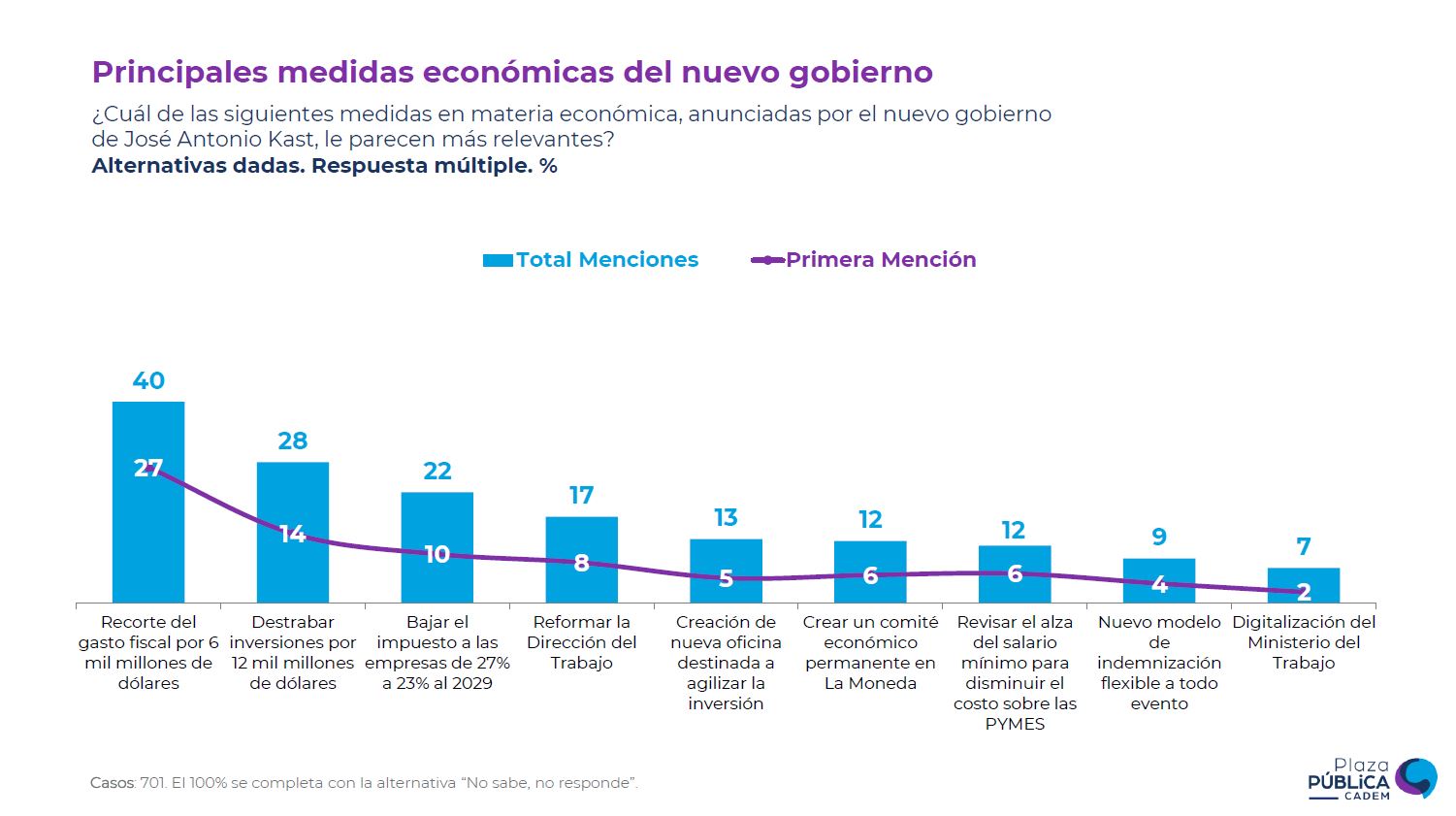 Ante la pregunta "¿Cuál de las siguientes medidas en materia económica, anunciadas por el nuevo gobierno de José Antonio Kast, le parecen más relevantes?", los 701 participantes de la encuesta contestaron de la siguiente forma: