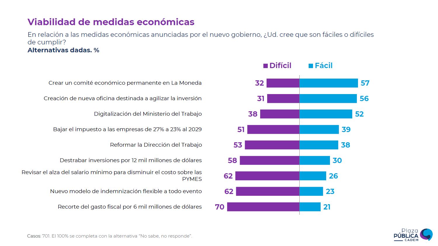 Para conocer la viabilidad de las propuestas económicas de Kast, Cadem preguntó: "En relación a las medidas económicas anunciadas por el nuevo gobierno, ¿Ud. cree que son fáciles o difíciles de cumplir?".