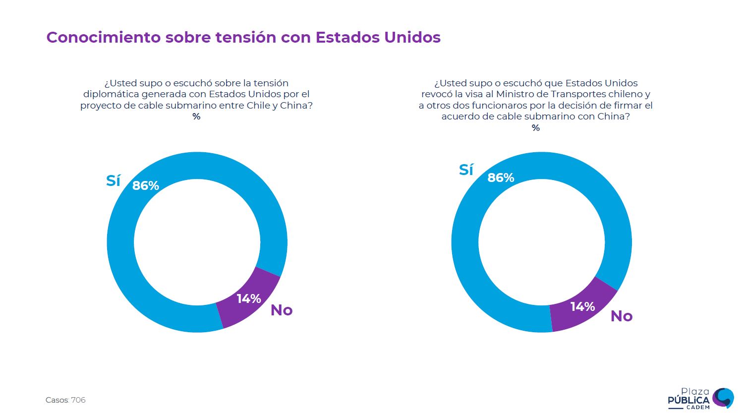 De modo introductorio, un 86% de los encuestados declararon conocer acerca de las tensiones con Washington debido al cable submarino entre Chile y China, mismo porcentaje que dijo conocer las sanciones en contra del ministro de Transportes, Juan Carlos Muñoz (IND), y otros dos funcionarios del Gobierno.