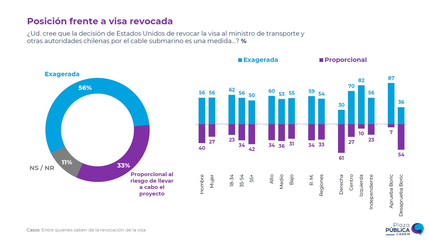 Frente a esto, un 56% consideró que la revocación de visas es una medida "exagerada" y un 33% indicó que era "proporcional al riesgo de llevar a cabo el proyecto".