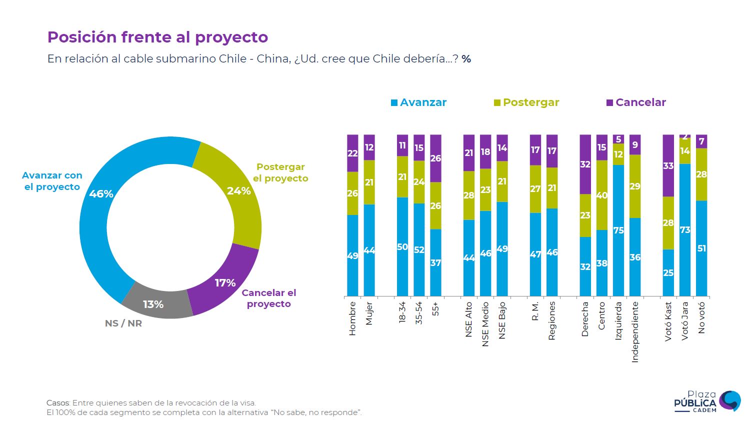 Además, un 46% de los consultados sostuvo que se debería "avanzar con el proyecto", frente a un 24% que se inclinó por "postergar el proyecto" y un 17% que señaló que se debería "cancelar el proyecto".