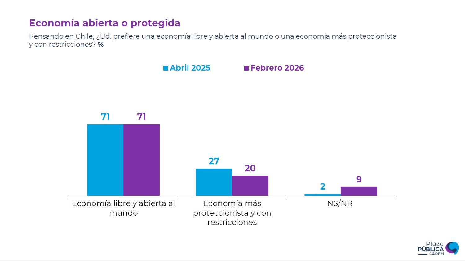 Frente a este panorama, Cadem preguntó por el tipo de economía que debería tener Chile, con un 71% afirmando que esta debería ser una "economía libre y abierta al mundo", frente al 20% que considera que el país debería tener una "economía más proteccionista y con restricciones".