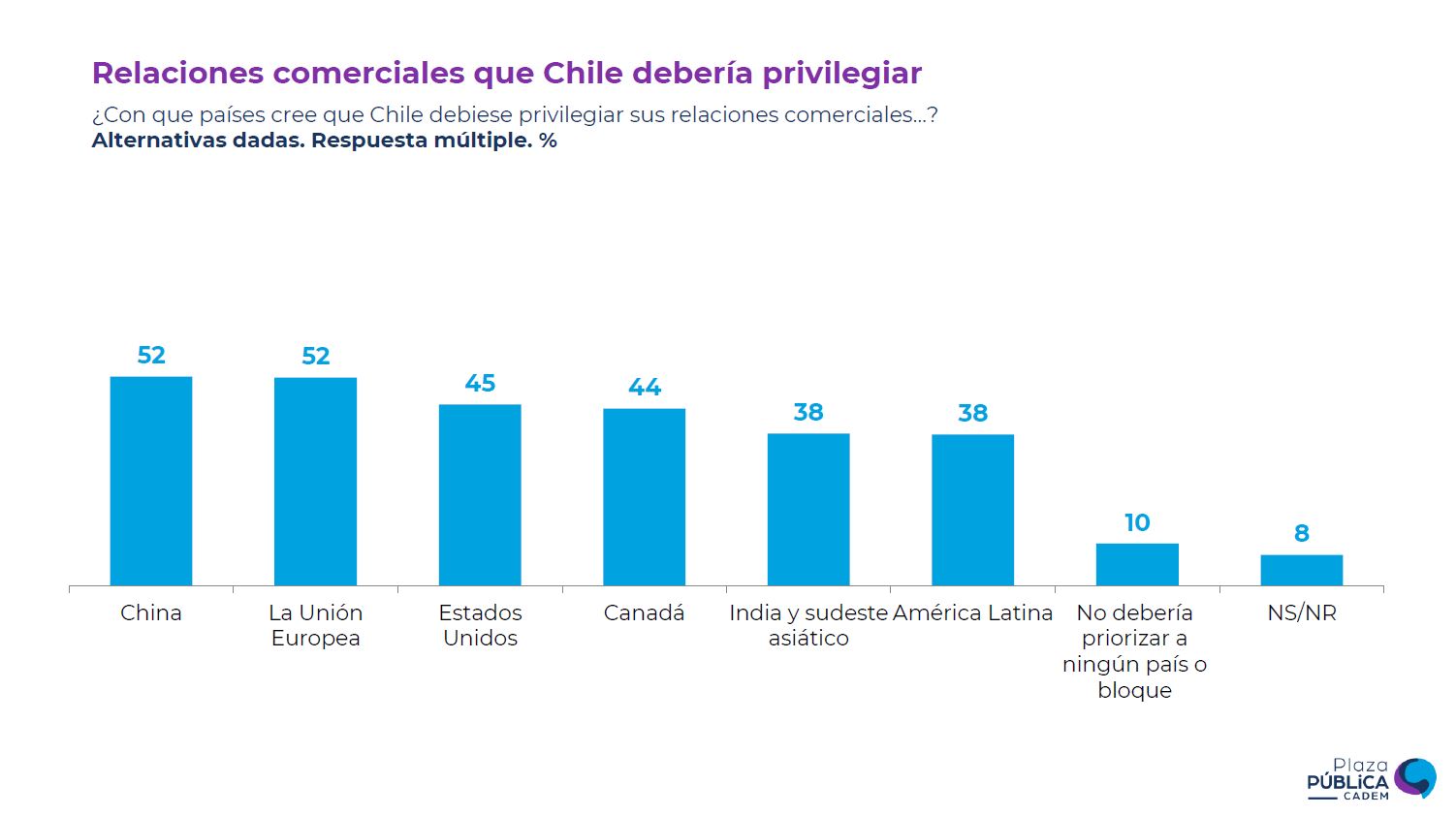 En cuanto a las relaciones comerciales que debería privilegiar el país, el apoyo se distribuyó de la siguiente forma: China (52%), la Unión Europea (52%), Estados Unidos (45%), Canadá (44%), India y Sudeste Asiático (38%), América Latina (38%) y No debería priorizar ningún país o bloque (10%).