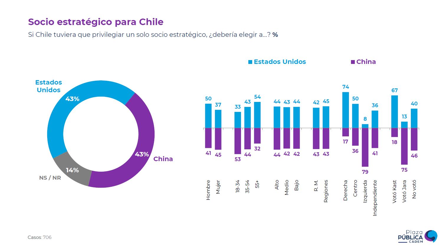 En el escenario hipotético de tener que privilegiar un solo socio estratégico, China y Estados Unidos quedan empatados con un 43% de las preferencias, con tan solo un 14% que no sabe qué contestar o no respondió.