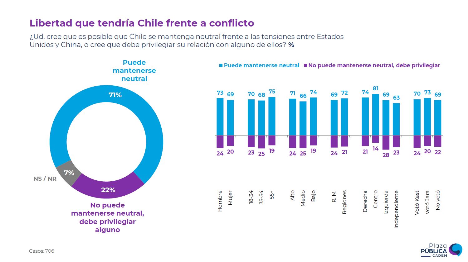 Finalmente, ante la posibilidad de que Chile se mantenga neutral frente a las tensiones entre China y Estados Unidos, un 71% afirmó que el país "puede mantenerse neutral", frente al 22% que indicó que "no puede mantenerse neutral, debe privilegiar a uno".