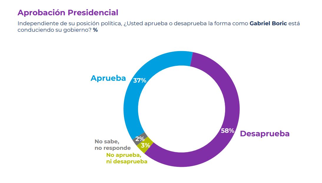 Al otro extremo, un 53% de los encuestados calificó el gobierno del Presidente Gabriel Boric como "malo o muy malo", siendo el peor calificado entre todos los otros mandatarios.