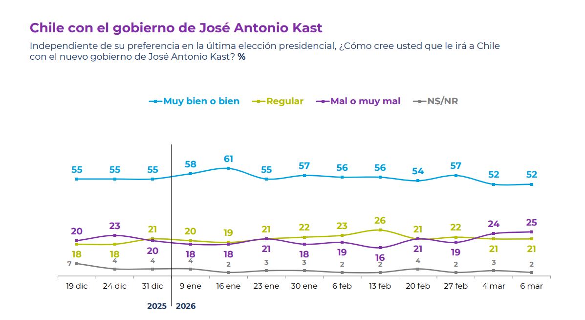También se abordó cómo creen los encuestados que le irá al futuro gobierno de Kast, cuya expectativa positiva se mantiene estable sobre el 50%.