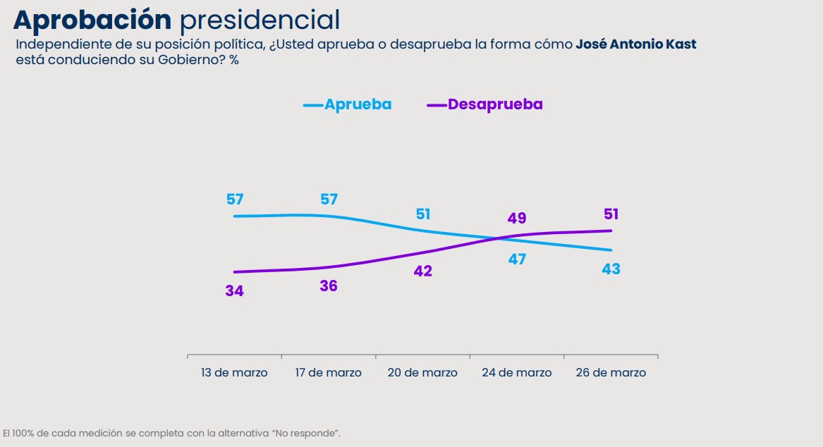 Al evaluar la conducción del Presidente Kast, su aprobación vuelve a caer 4 puntos y alcanza el 43%, mientras que su desaprobación llega a 51% (+2pts).