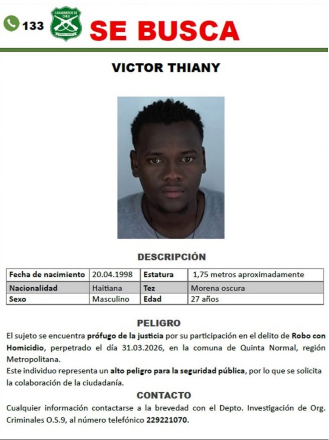 Carabineros emitió una alerta para dar con el paradero de un ciudadano haitiano acusado de asesinar a una comerciante adulta mayor en la comuna de Quinta Normal, en la Región Metropolitana. El sujeto, actualmente prófugo, es considerado de alto peligro y se le busca por el ilícito de robo con homicidio.