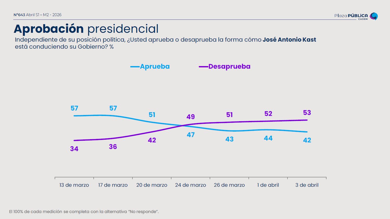 La encuesta Plaza Pública de Cadem de este domingo 5 de abril abordó nuevamente la evaluación al Gobierno y la figura del Presidente de la República, José Antonio Kast, quien por segunda semana consecutiva registra una desaprobación superior a su aprobación.