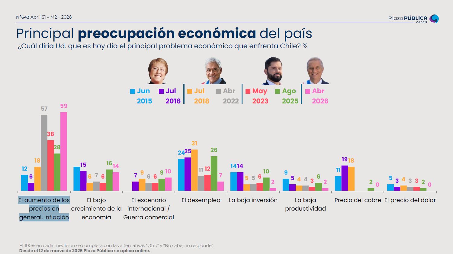 Cadem consultó también en esta oportunidad sobre cuál es la principal preocupación económica del país durante este casi primer mes de Gobierno, por lo que preguntó: "¿Cuál diría Ud. que es hoy día el principal problema económico que enfrenta Chile?".