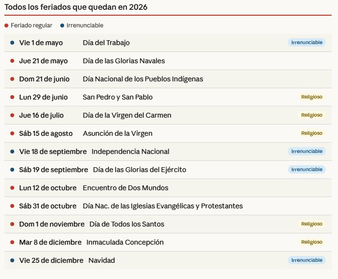 Luego vendrán las Fiestas Patrias en septiembre, aunque serán de las más breves de los últimos años: el 18 de septiembre cae viernes, dejando solo tres jornadas de festejo. Eso sí, tanto el 18 como el 19 son feriados irrenunciables, garantizando días corridos de descanso obligatorio.