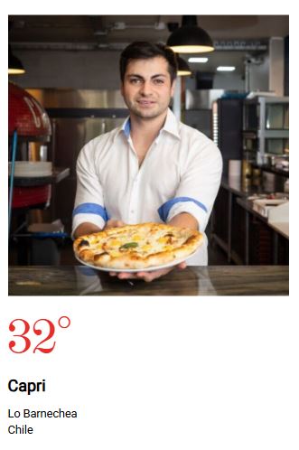 El puesto cinco de las pizzerías chilenas que entraron al Top 50, le pertenece a Capri, que se ubicó en el N.º 32. Esta pizzería tiene dos sucursales, una en El Rodeo 13052, Lo Barnechea y otra en Gerónimo de Alderete 1423, Vitacura.
