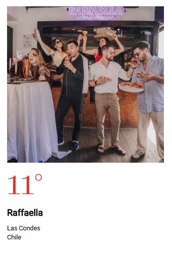 Le sigue Raffaella, localizada en Nuestra Señora del Rosario 21, Las Condes, en la posición N.º 11. A través de las historias de Instagram del restaurante Javier Gómez informó que viajarán a Napoli, Italia a competir por las mejores pizzerías del mundo.