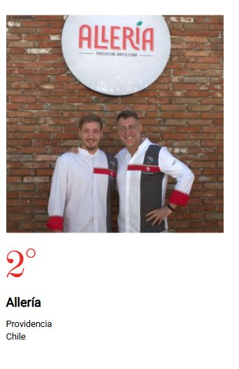En total, siete pizzerías chilenas lograron posicionarse dentro de los 50 mejores lugares de Latinoamérica. El listado está encabezado, en cuanto a representación nacional, por Allería, ubicada en la Avenida Italia 1350, comuna de Providencia. Este restaurante alcanzó el puesto N.º 2 de la región.