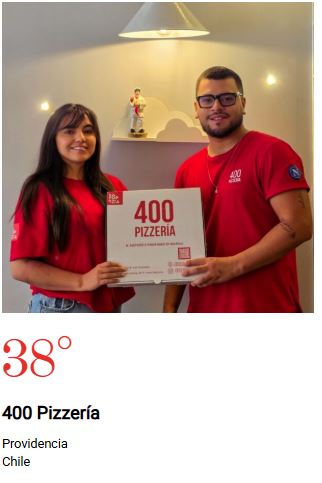 La penúltima en entrar al ranking es 400 Pizzería que alcanzó la posición N.º 38 y se ubica en General Flores 24, comuna de Providencia. Según la información en su biografía de Instagram, esta es la tercera vez que entran al top.