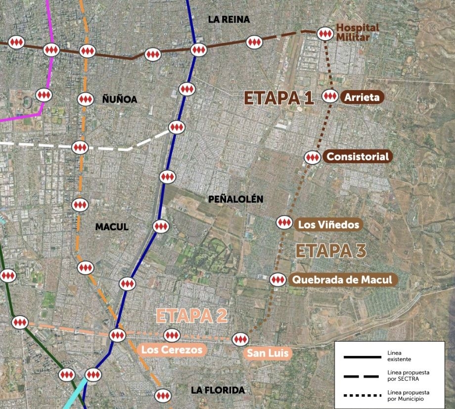El plan de expansión diseñado por los alcaldes Miguel Concha en Peñalolén y José Manuel Palacios, de La Reina, establece un recorrido que se dividiría en dos etapas de crecimiento de la Línea 3.