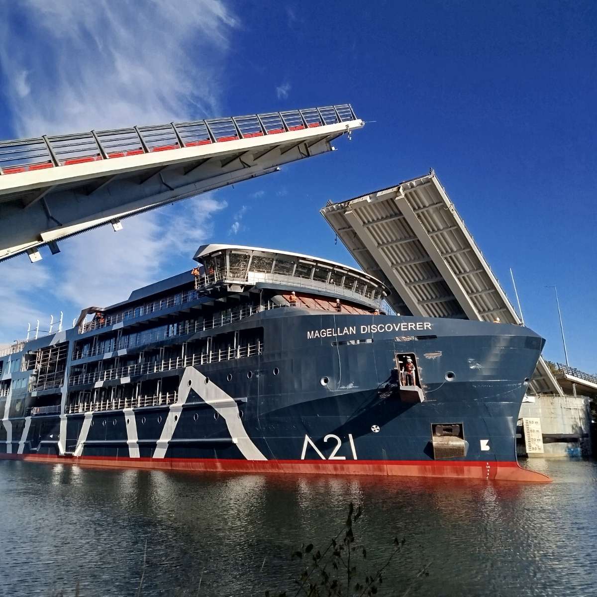 Debido a sus dimensiones de 94 metros de largo (eslora), 17,20 metros de ancho (manga) y 30,5 metros de altura, el paso del navío por el Puente Cau Cau requirió de un trabajo conjunto con el MOP, ya que el viaducto requirió una basculación especializada de 30°, superando su apertura habitual cercana a los 28°.