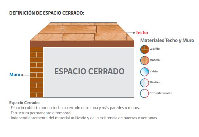 De acuerdo a la nueva ley, se entenderá como "espacio cerrado" aquel espacio cubierto por un techo o que se encuentre entre una o más paredes o muros, sin importar el material utilizado, la existencia de puertas o ventanas y que la estructura sea permanente o temporal.