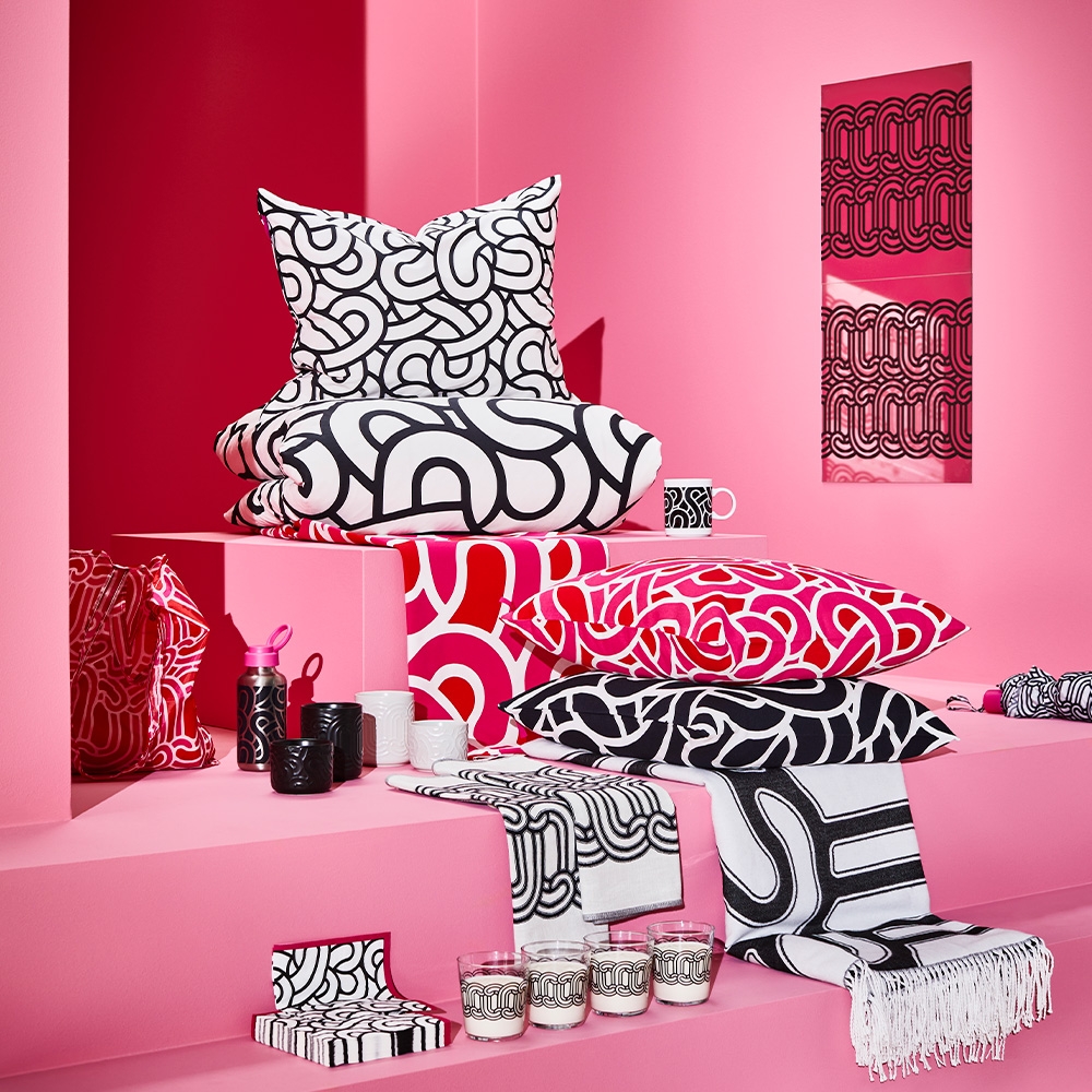 Cada producto de la colección resalta por el inconfundible diseño circular de la artista que cobra vida en tonos vibrantes, con fuertes expresiones gráficas para darle una atmósfera de Tokio al hogar.