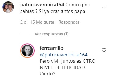 “Sí. Eso pensé yo”; “¿Y tu primer hijo?”, le escribieron, pero Fernando Carrillo contestó como mucha elegancia: “Pero vivir juntos es otro NIVEL DE FELICIDAD. Cierto?”.