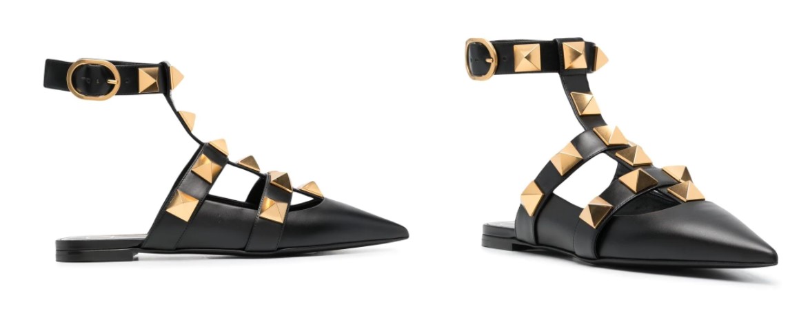 Las zapatillas tienen un diseño súper moderno, de suela plana con forma puntiaguda en la parte delantera, tira en el tobillo con hebilla y apliques en forma piramidal doradas, diseño perfecto para sentirse cómoda y sofisticada a la vez.
