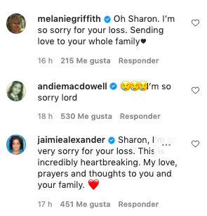 “Oh Sharon. Lo siento por su pérdida. Enviamos amor a toda tu familia”, escribió la reconocida actriz ganadora de un Globo de Oro, Melanie Griffith. “Lo siento mucho”, dijo otra famosa intérprete, Andie Macdowell.