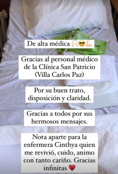 Finalmente informó que recibió el alta médica y agradeció al personal de salud por "su buen trato, disposición y claridad". "Gracias a todos por sus hermosos mensajes", añadió en su mensaje.
