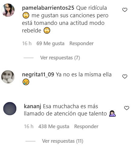 “Me gustan sus canciones, pero está tomando una actitud modo rebelde”; “Ella ya no es la misma”; “Esa muchacha es más llamado de atención que talento”; "Sacó su verdadera esencia”; “¿Qué le pasa a ella?”, fueron algunas de las críticas que le hicieron los usuarios en Internet.
