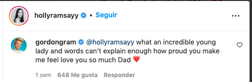 Las palabras de Holly despertaron la admiración de sus seguidores. Uno de los primeros en reaccionar fue su famoso padre que comentó con admiración: “Holly Ramsay, qué increíble jovencita, y las palabras no pueden explicar lo suficiente lo orgulloso que me haces sentir. Te amo tanto, papá”, escribió el chef.