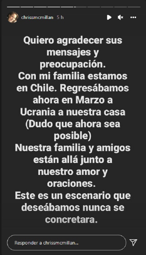 En la historia de la mencionada red social, la comunicadora contó que tenían planeado retornar en marzo y que dichos planes podrían ver truncados por el conflicto entre Rusia y Ucrania.