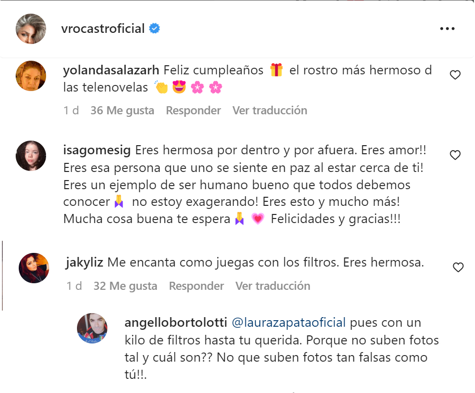 “Pues con un kilo de filtros. ¿Por qué no suben fotos tal y como son? No que suben fotos tan falsas como tú”, “me encanta cómo juegas con los filtros. Eres hermosa”, “feliz cumpleaños el rostro más hermoso de las telenovelas”, “eres hermosa por dentro y por afuera. Eres amor!! Eres esa persona que uno se siente en paz al estar cerca de ti”, fueron algunas de las reacciones.