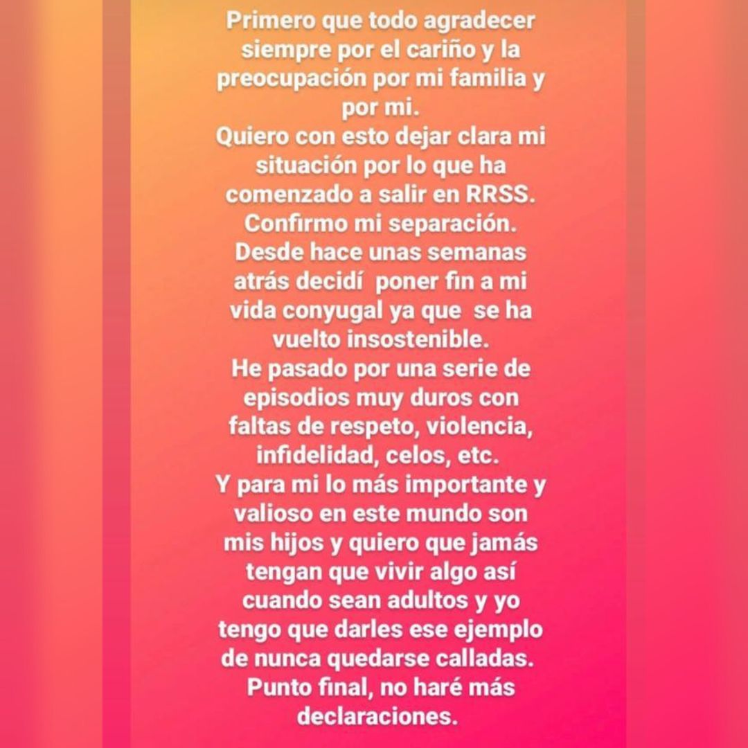 "Primero que todo agradecer siempre por el cariño y la preocupación por mi familia y por mí. Quiero dejar clara mi situación por lo que ha comenzado a salir en redes sociales. Confirmo mi separación. Desde hace unas semanas decidí poner fin a mi vida conyugal, ya que se ha vuelto insostenible", indicó en un principio.