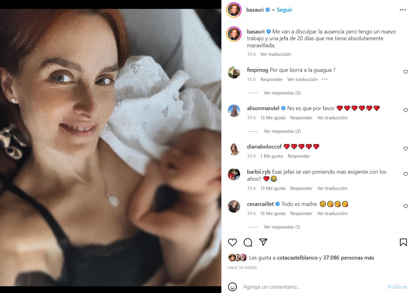 Durante sus primeros días como madre, Basauri utilizó sus redes sociales para compartir diversas reflexiones respecto a lo que ha significado la maternidad en su vida y para agradecer las muestra de cariño que recibe.