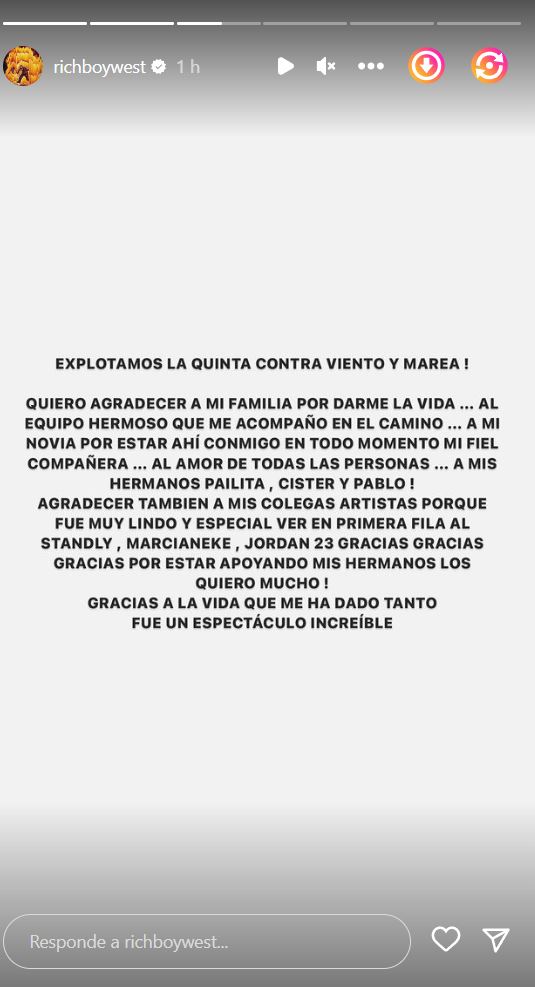"Sigo aclarando que lo de ayer no fue culpa de @richboywst (Polimá) él solo quería que todos brilláramos juntos como lo hemos hecho siempre", señaló en una publicación que realizó esta tarde.